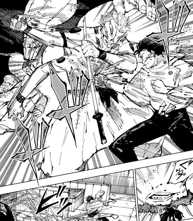 乙骨は刀で宿儺に斬りかかりますが、宿儺は刀を手で掴んで斬撃を防ぎます。この時、宿儺は細かい斬撃をチェンソーのように手の表面に纏って、刃に触れないようにしつつ刀を掴んでいて、刀を掴んだ手のひらにもダメージはありません。刀を掴まれた乙骨は刀を手放すと、宿儺の腹にパンチをくらわせます。また、リカが宿儺の後ろに回りリカもパンチを浴びせようとしますが、リカの攻撃は宿儺の二本の腕を使って防ぎます。リカのパンチは防がれましたが乙骨のパンチは当たっていて、宿儺の腹の口から、ぐヴヴ、という声が漏れている事からある程度、乙骨の攻撃は効いているようです。