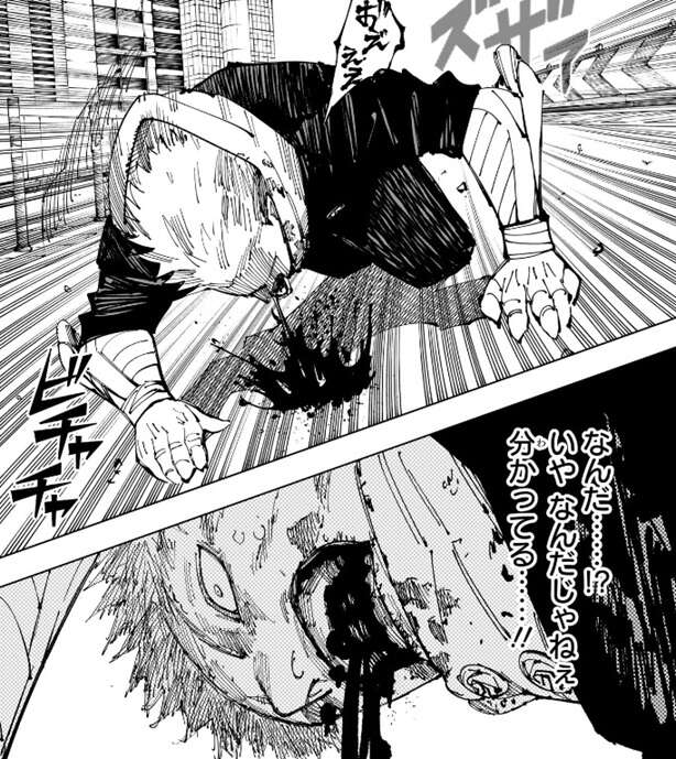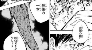 虎杖は伏黒の事を思いつつ、さらに宿儺に打撃を与えようとしますが、突然血を吐いて倒れます。虎杖は吐血した理由を分かっていて、反転術式のような覚えたての大技で、普通なら死んでいる傷を4度も治したので、完全に治しきれていない箇所がどこかにあると早く傷を探そうとします。