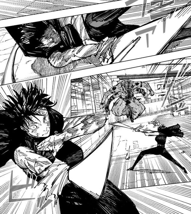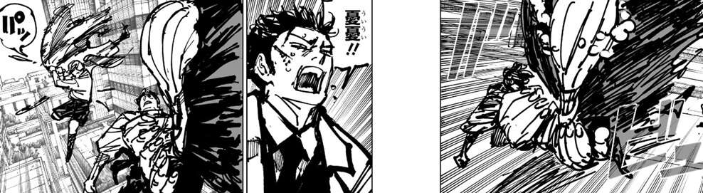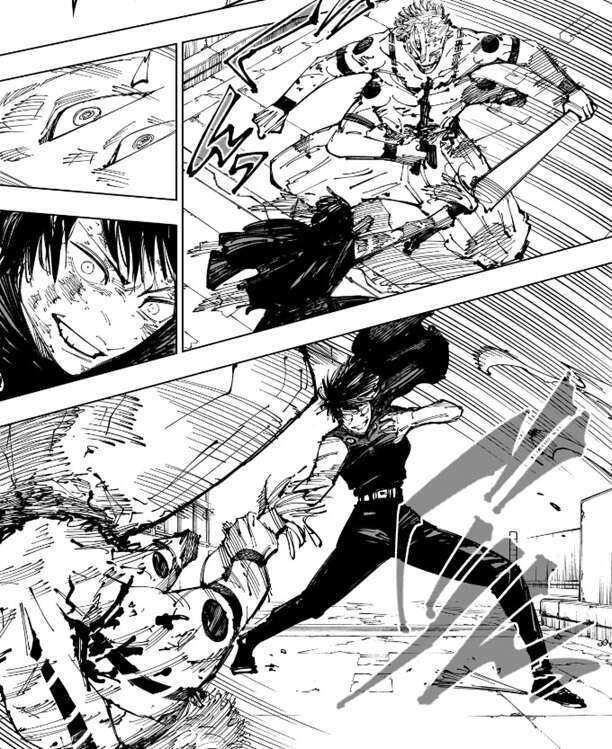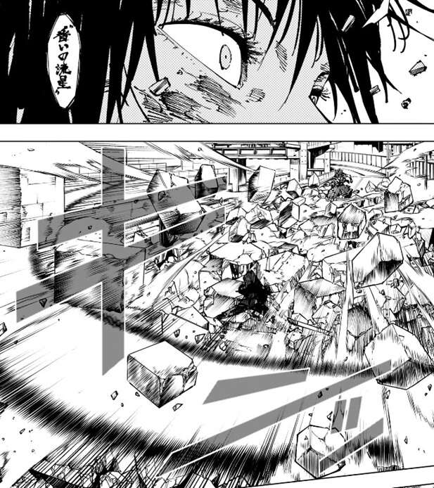 宿儺は真希の攻撃をかわしますが、真希は攻撃の手を緩めず、徐々に宿儺を追い詰めていきます。真希は釈魂刀を掴んだ宿儺を投げ飛ばしますが、宿儺は斬撃でいくつもの残骸を作ると、残骸を真希に投げ飛ばします。