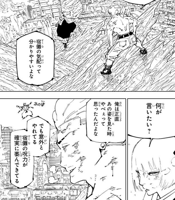 他の術師より俺の術(ざんげき)がよく見えているな、渋谷で魔虚羅と戦った時のようだ、と宿儺は心の中でつぶやき真希の強さを評価します。一方、真希は宿儺が心臓を修復と同時に呪力で強制的に動かしている事に気付きます。宿儺が少年院の事件の時、心臓なしでも生きられると伏黒から聞いていたようですが、真希は改めて目の前で見て少し驚いているようです。心臓、私と戦いながら続けんのか?と、真希が質問すると、今のところ問題ないな、と宿儺は平然と答えます。