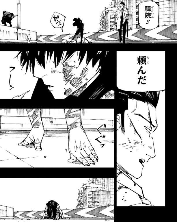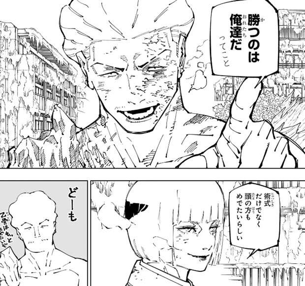 日下部は、てかここにいる何人が特級術師の周りでチョロチョロ立ち回れるかっちゅー話だ、と領域に入っても役に立たないと言いたげですが、いやアンタはいけるだろ、と猪野は日下部にツッコみたそうです。そして、日下部は真希に全てを託します。託された真希はクラウチングスタートの格好で待機します。場面は乙骨の領域が破られた場面に戻り、乙骨の合図は宿儺が一番緩んだ時に上がるので、最高と最悪の光景になる事は想定していたと日下部は心の中でつぶやきます。