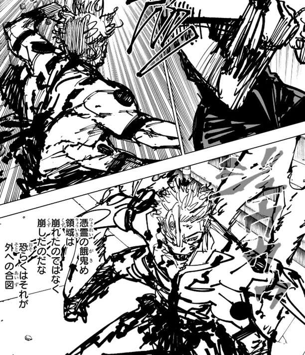 真希に釈魂刀で斬られた宿儺は後ろに下がりつつ、乙骨の領域は崩れたのではなく、自分で崩したのだと推測します。そしてそれが領域外にいる高専術師への合図という事も、宿儺は推察します。
