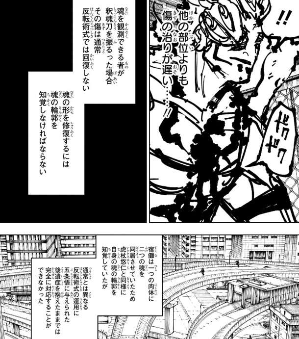 勝利を確信した宿儺の目を結界の亀裂でひき、真希で刺す、という作戦だったのだろうと宿儺は推測します。さらに、呪具である釈魂刀は予め領域内に置いていたのだろうと宿儺は考えます。宿儺は他の部位より、釈魂刀で斬られた傷の治りが遅いことに気付きます。魂を観測できる者が釈魂刀を振るった場合、その傷は通常の反転術式では回復しないようです。魂の形を修復するには、魂の輪郭を知覚しなければならないようですが、宿儺は虎杖と同様に自身の魂の輪郭を知覚できます。しかし、通常とは異なる反転術式の運用を、五条悟に与えられた後遺症を抱えたままで完全に対応する事は、さすがの宿儺といえども出来ないようです。
