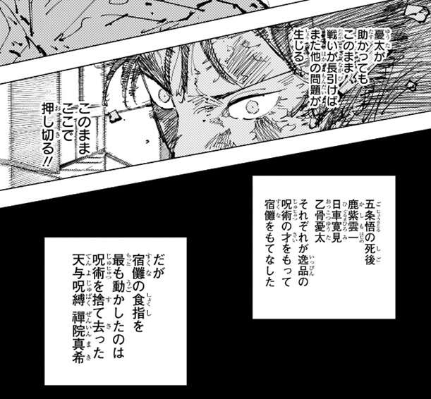 真希は乙骨が助かってもこのまま戦いが長引けば次の問題が生じると考え、宿儺をここで倒しておこうと考えます。一方、五条悟の死後、鹿紫雲一、日車寛見、乙骨憂太、それぞれが逸品の呪術の才能で宿儺をもてなしました。しかし、宿儺の食指を最も動かしたのは、先ほどの三人ではなく呪術を捨て去った天与呪縛の禪院真希でした。この現実に、宿儺は高揚していて好戦的になってきます。