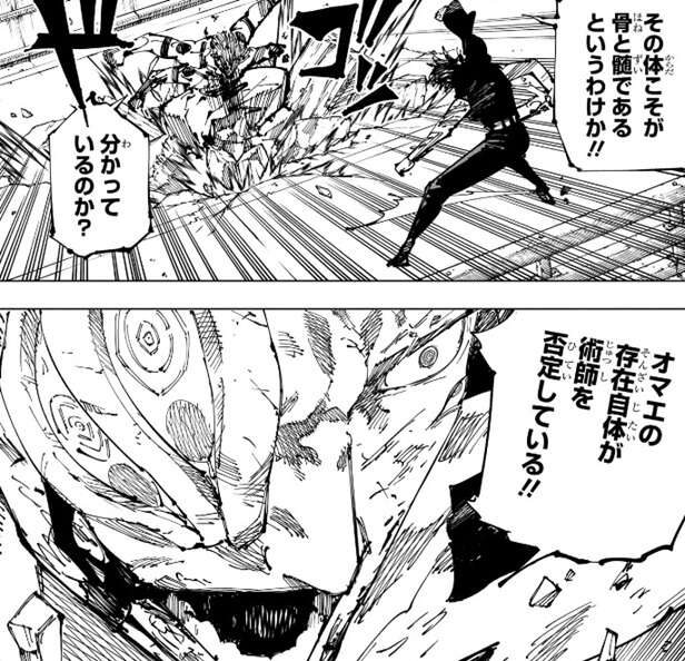 呪術は所詮皮や肉でしかなく!!その体こそが骨と髄であるというわけか!!と、興奮した宿儺は真希に一方的に語ると、真希の存在自体が術師を否定していると言い放ちます。
