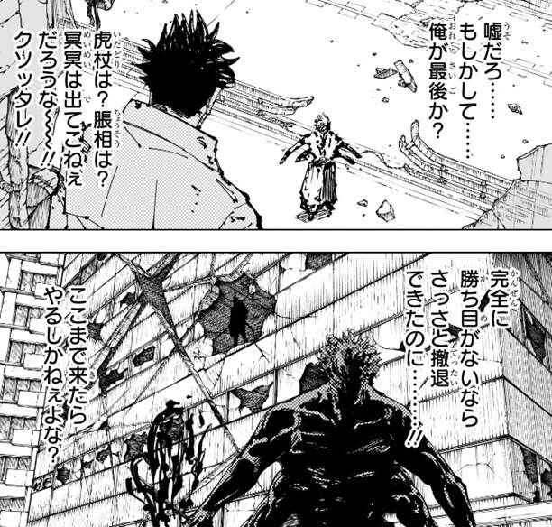 その光景をビルの中から見ているのが、現状唯一戦えそうな日下部です。虎杖は反転術式による治癒中で、脹相も虎杖の事が心配なので戦闘に参加できないでしょう。二人とも一時的に戦線離脱状態で、冥冥は出てこねぇだろうな~!!クソッタレ!!と、日下部は心の中でつぶやきます。つまり今は日下部しか戦えそうにありませんが、完全に勝ち目がないならさっさと撤退できたのに………!!と、日下部は心の中でつぶやき戦いたくなさそうです。しかしこれだけ宿儺にダメージを与えていますし、日下部も、ここまで来たらやるしかねぇよな?と、考えます。
