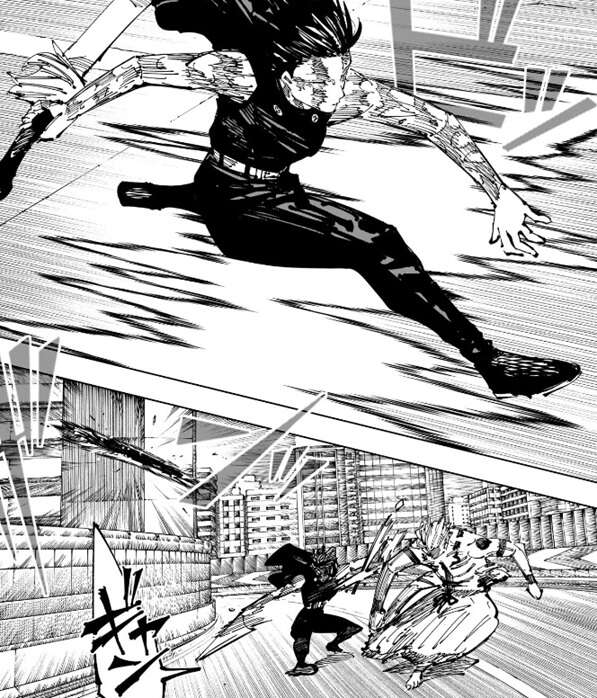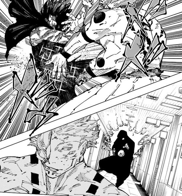 真希に攻撃され、今度は宿儺が吹っ飛ばされ、壁に叩きつけられます。立ち上がる宿儺に、真希は高速で移動しつつ、さらに追撃しようとします。