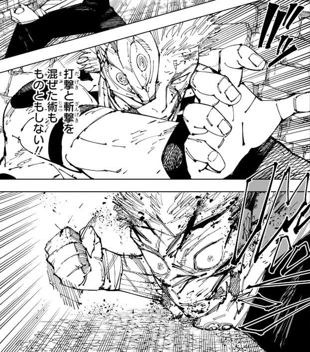 宿儺は地面に手を当てて第215話で使った「蜘蛛の糸」のように地面を斬撃で破壊し、さらに打撃を虎杖にくらわせようとしますが、虎杖は宿儺の腕を掴んで打撃を防ぎます。打撃と斬撃を混ぜた術も通用せず、宿儺は虎杖に普通の斬撃を飛ばしますが、虎杖はまたダメージ覚悟で飛んでくる斬撃を無視して、宿儺にパンチをくらわせます。