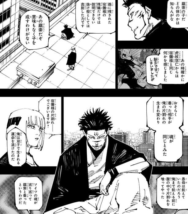 冒頭は新宿決戦前の回想となり裏梅が宿儺に、虎杖悠仁とは何者なのですか?と、質問しています。裏梅は虎杖から宿儺と同じ何かを感じ取っていて、それが虎杖に残された宿儺の残穢だけでは説明できない、抜け殻としては逸脱した力、と宿儺に言っています。すると、宿儺は羂索が番った相手、つまり虎杖悠仁の父親・虎杖仁が宿儺の片割れの生まれ変わりだと話し始めます。宿儺はもともと双子で生まれる運命だったそうですが、母親が飢えていた為に、宿儺は自分まで飢えてしまう前に腹の中で片割れを喰ってしまったそうです。宿儺に喰われてしまい生まれてこなかった片割れの魂が、巡り巡って現代で虎杖仁として生まれ変わり、その後羂索に肉体を乗っ取られた虎杖香織との間に出来た子供が虎杖悠仁だったようです。