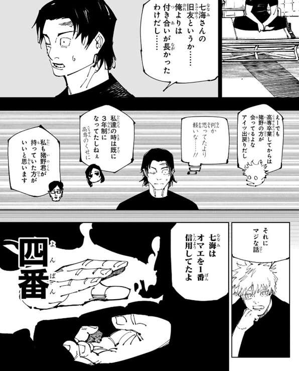 ここで再び回想に入り、猪野が七海の遺した大鉈の呪具を使うようになった経緯が描かれます。新宿決戦前、猪野は五条に七海が残した呪具を使わせて欲しい、と許可を取ろうとしていました。好きにしなよと言う五条、さらになんで僕達に聞くのと逆に猪野に質問します。猪野は、七海との付き合いが俺より長い事を理由に挙げますが、高専を卒業してからは猪野の方が会っていると言い、家入と伊地知も猪野が持つことに賛成します。そして最後に五条は、七海はオマエを一番信用してたよ、と猪野に言います。