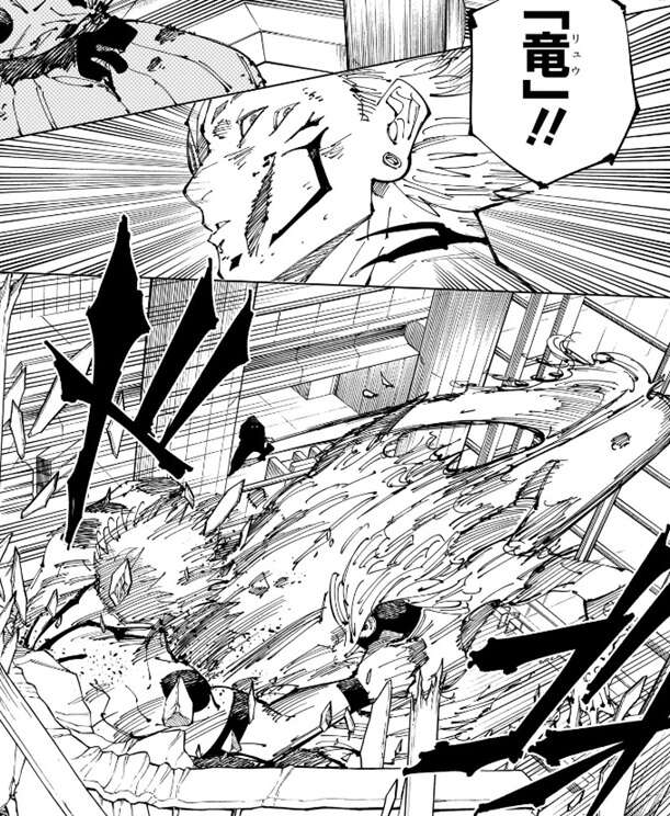 宿儺は「竜」をくらって壁に激突しますが、宿儺はすぐに「竜」を斬撃で倒します。そこに猪野が背後から七海の遺した大鉈の呪具で攻撃しますが、宿儺は足で呪具を防ぎます。クソッ、と悔しがる猪野ですが、猪野が作った宿儺の隙をついて虎杖が拳を構えて、宿儺を背後から攻撃します。