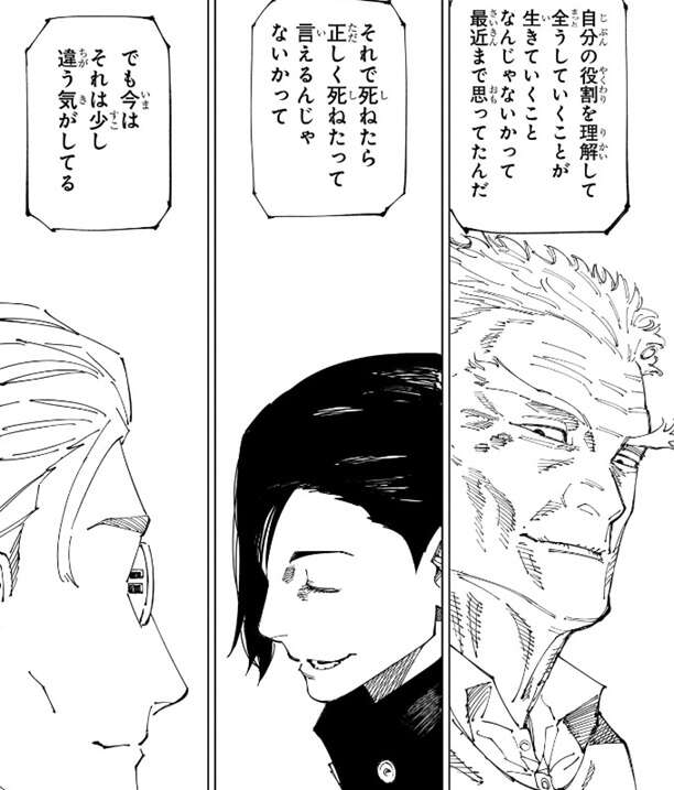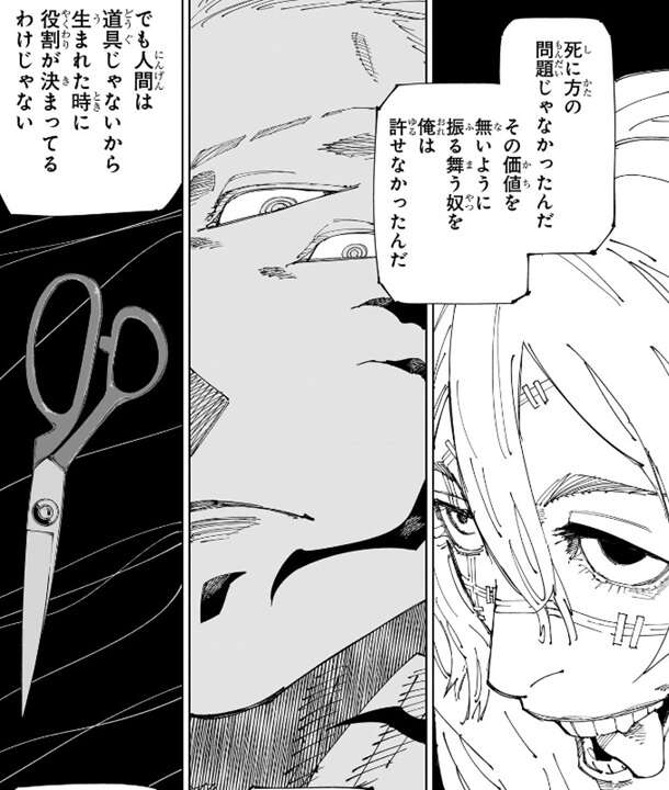 死に方の問題ではなく、その価値を無いように振舞う奴が嫌いで、宿儺が嫌いだと虎杖は言います。それでも人間は道具でないので、善い奴も悪い奴もどっちが本当の人間かなんて分からないと虎杖は言います。
