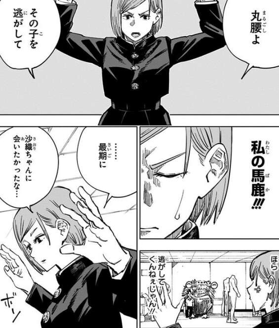 釘崎は呪力をこめた釘を打ち込んで相手を攻撃する術式「芻霊呪法(すうれいじゅほう)」の使い手で、呪霊を芻霊呪法で順調に祓っていきます。しかし、もう一体の呪霊には知性があり、子供を人実にして釘崎を脅します。釘崎は子供の命を優先し武器を捨てますが、呪霊は子供を見逃そうとせず、釘崎と子供の二人共を殺そうとします。最後は、虎杖が壁越しに呪霊を攻撃し子供を助け、釘崎が芻霊呪法「共鳴り」で呪霊に止めを刺します。