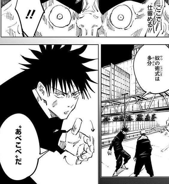 虎杖と伏黒は粟坂二良と戦いますが、何度攻撃してもほとんどダメージを与えられず粟坂二良の異常なタフさに苦戦します。伏黒は粟坂二良の異常なタフさには、十中八九 術式が絡んでいると考え、五条悟が渋谷に来ている、と粟坂二良を挑発して様子を見ます。その後粟坂二良の受け答えから、粟坂二良では五条悟に勝てない事、攻撃用でない「脱兎」が粟坂二良に効いた事、などから伏黒は粟坂二良の術式の正体を推測します。