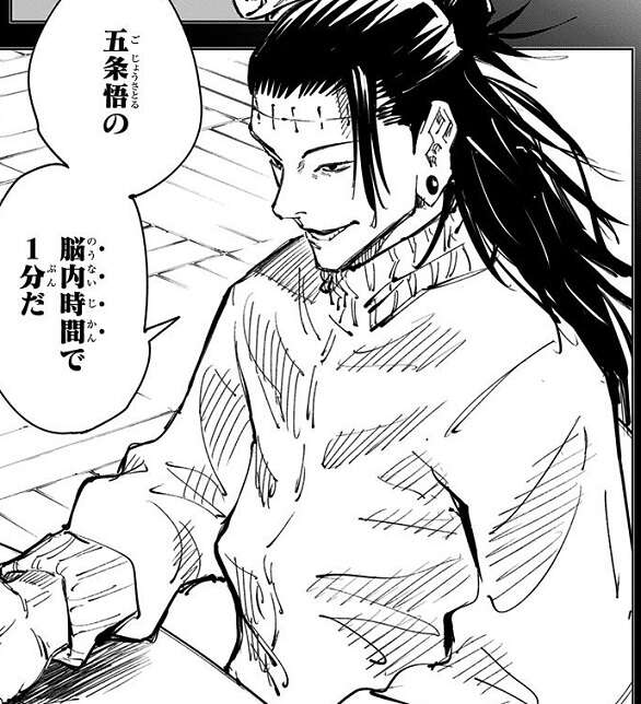 偽夏油は獄門疆を開門し五条悟を封印しようとしますが、封印するには獄門疆開門後、封印有効範囲の半径約4メートル以内に1分間、五条悟を留めなければなりません。回想の中で漏瑚は五条悟をその条件下で一分間留めるのは無理難題と激怒しますが、1分間は五条悟の脳内時間で1分であればよく、条件を満たした獄門疆は五条悟を捕縛します。