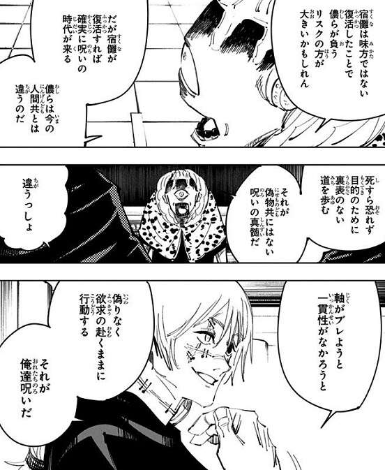 漏瑚は宿儺を復活させようとしますが、真人と脹相は虎杖を見つけたら殺すと勝手に決めてしまい、虎杖を探しに地下五階を勝手に離れてしまいます。