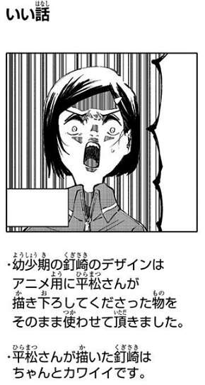 幼少期の釘崎のデザインはアニメ用に平松さんが描き下ろしたものを、そのまま使ったようです。6歳の時の釘崎野薔薇は、第124話、第125話で描かれています。