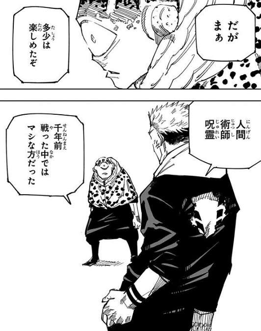 調伏の儀を無かったこととする為、宿儺は魔虚羅を倒そうとします。しかし、宿儺が斬撃を魔虚羅に与えても、後ろの法陣が回ると魔虚羅の傷は癒えてしまいます。さらに、後ろの法陣が回った後 魔虚羅は宿儺にとって相性の悪い特性へと変化し、宿儺を追い詰めます。