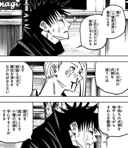 伏黒は満身創痍の状態だった所に、重面春太に襲われてしまい、覚悟を決めて奥の手を使う決心をします。伏黒は「十種影法術」の説明を始め、何度か倒れながらも重面春太に式神を調伏する手順を説明します。