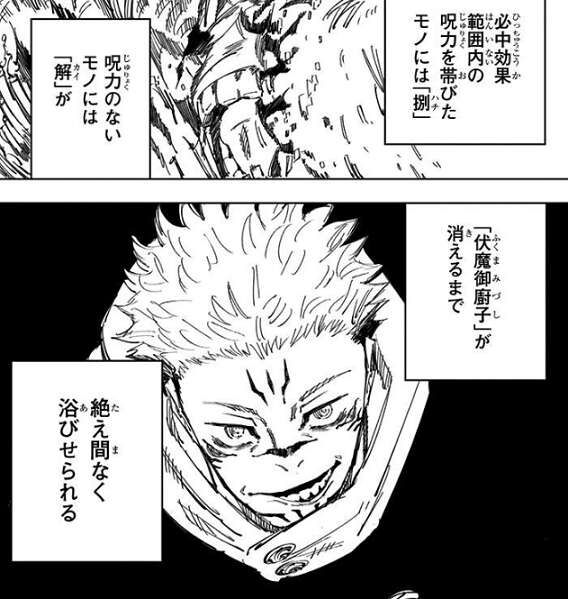 宿儺は領域展開「伏魔御廚子(ふくまみづし)」を使用し、必中効果範囲内の呪力を帯びたモノには「捌」を、呪力のないモノには「解」を、「伏魔御廚子(ふくまみづし)」が消えるまで絶え間なく浴びせます。