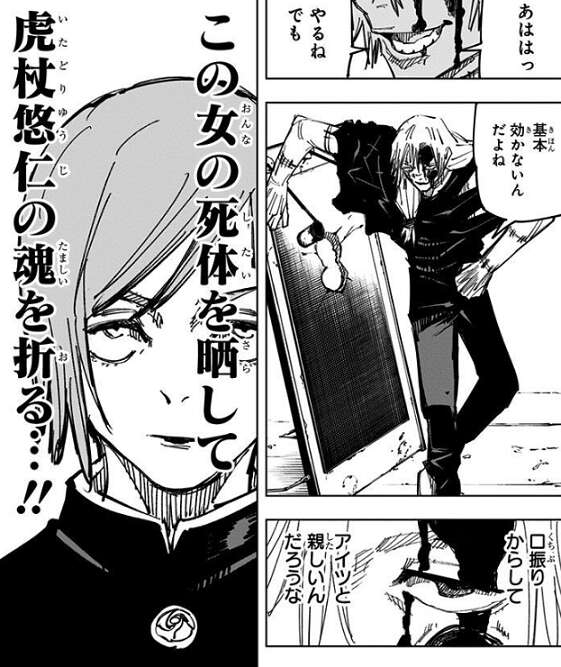 目の前で七海を真人に殺された虎杖は、真人を殺そうとしますが「撥体」で攻撃を防がれてしまい、反撃をくらってしまいます。人の命を弄ぶ真人に対して虎杖は激怒しますが、真人から、オマエは俺だ、そいつを認めない限りオマエは俺に勝てない、と言われます。虎杖は怒りで我を忘れないように、冷静に七海の最後の言葉を思い出そうとします。