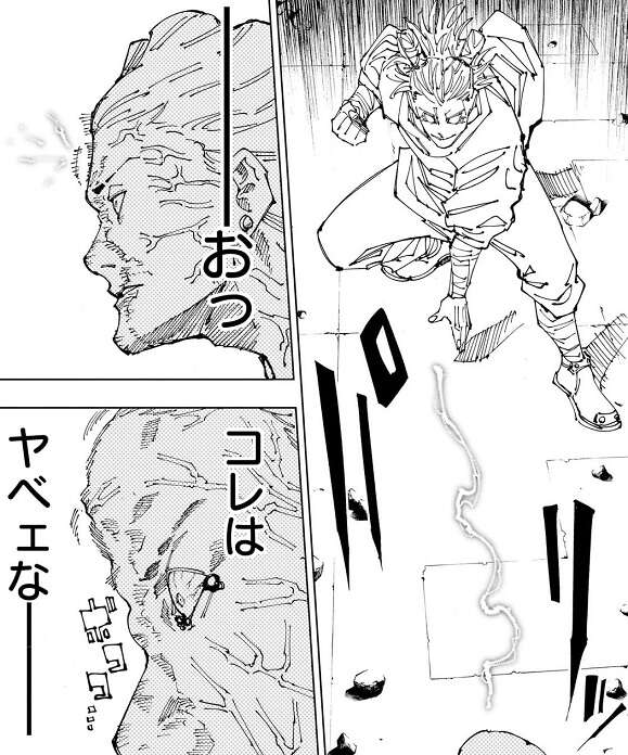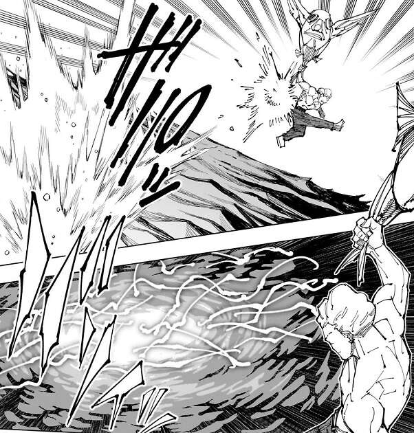 秤と鹿紫雲一はコンテナを挟んで激しい殴り合いを行い、コンテナが壊れた後は、秤が大きく振りかぶって鹿紫雲一を殴ろうとします。しかし、鹿紫雲一は秤のパンチを避けると、コンテナの一部で秤の顔面を強打、秤は顔面の皮膚がめくれる重傷を負います。さらに、一撃で頭を潰せばどんな強力な反転術式使いでも死ぬ、と頭の中でつぶやくと、鹿紫雲一は稲妻を秤の頭で炸裂させようとします。