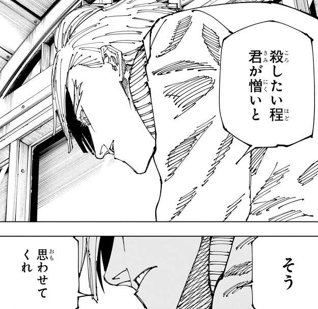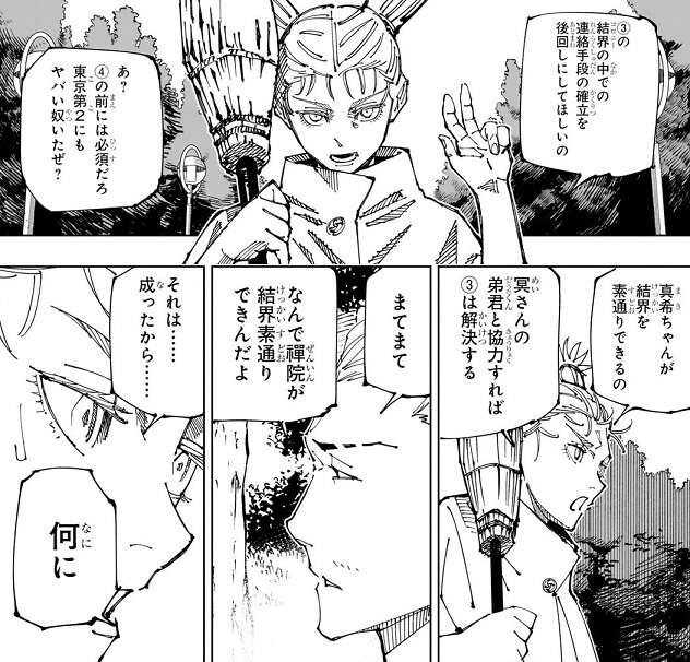 鹿紫雲一の水蒸気爆発をしのいだ秤は、鹿紫雲一に取引を持ちかけて仲間に引き込みます。宿儺と戦わせるという条件と引き換えに鹿紫雲一を仲間にした秤は、その後シャルル、西宮と合流します。西宮から追加予定のルールの話を聞いた流れで、真希が呪力を完全に持たない怪物に成った事を秤は聞きます。