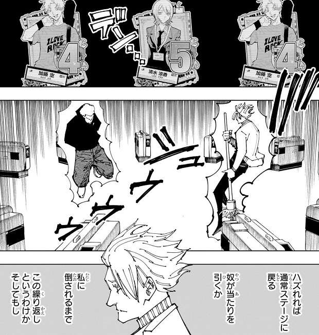 稲妻攻撃が秤の脇腹に直撃し、秤は致命傷を負います。秤はその状態でさらに領域展開「坐殺博徒」を使用しますが、鹿紫雲一は苦しまぎれの領域展開で、秤は何もできないと思い、料理を確信します。しかし、秤は時短潜伏(見かけは時短だが、確変に入っている状態)からの突発大当たりを引き、再び無敵モードとなります。秤は正に豪運の持ち主でした。その後、秤が結界の座標をズラし海上へと移動、鹿紫雲一を海中へと蹴り落とします。