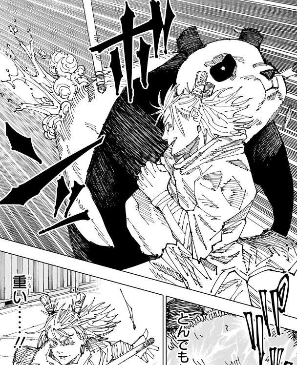 電気の呪力を持つ鹿紫雲一に一方的にやられてしまったパンダは、「お兄ちゃん」核と「お姉ちゃん」核をやられてしまいます。2つの魂の情報を失ってしまったパンダは、パンダの心の中の世界でお兄ちゃんとお姉ちゃん、2人を見送る経験をします。そして、現実ではパンダは体を引き裂かれてしまい絶体絶命のピンチに陥りますが、そこに秤が参戦します。