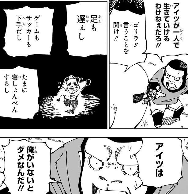 秤と一緒に東京第2結界(コロニー)に入ったものの、パンダは結界入場時のランダム転送で秤と離れ離れとなってしまいます。濃い血の匂いがする状況から手練れの呪術師がいる可能性が高いとパンダは推測し、この場所を離れようとしますが、あっさりと鹿紫雲一と遭遇してしまいます。鹿紫雲一はパンダがプレイヤーと分かると、いきなり近接戦闘を仕掛けてきます。