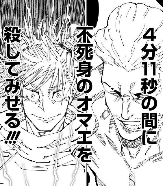 再び領域展開「坐殺博徒」を使用し、さらに確変に突入した秤は大当たりを引き当て、またも4分11秒間の無敵モードとなります。本来なら4分11秒間の無敵モードをいなして、秤が無敵モードでなくなった時を鹿紫雲一は狙うべきですが、それは雑魚の思考だ、と心の中でつぶやくと、4分11秒の間に不死身の秤を殺そうと怒涛の攻撃を始めます。