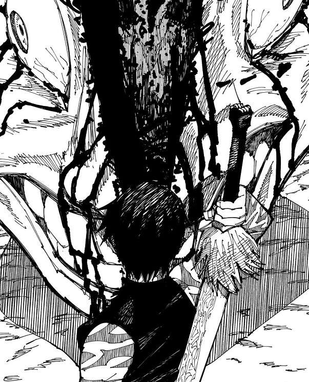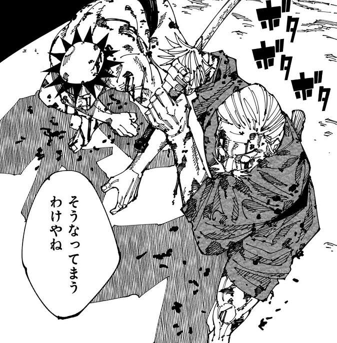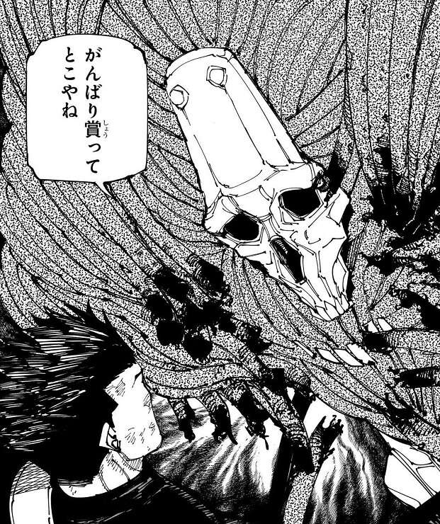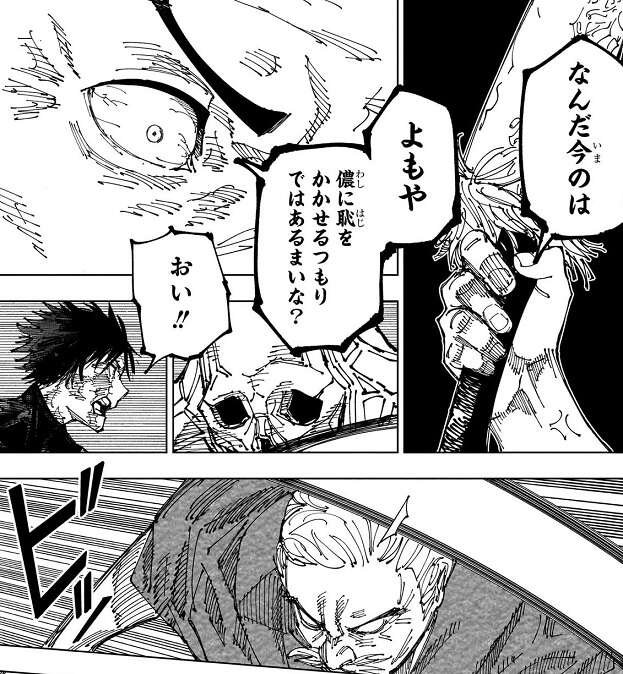 突然乱入してきた二人は、大道鋼と三代六十四という新たな死滅回游プレイヤーでした。直哉は二人の乱入プレイヤーを無視して加茂憲紀を攻撃しますが、真希が再び戦いに戻り重傷を負った加茂憲紀を助けます。しかし、真希の傷も回復しきれておらず依然厳しい状況で、真希は手詰まりの状況を打開する為、刀を欲している大道に自分の刀を渡します。刀を受け取った大道は圧倒的殺傷能力を放ち、その力に四人は気圧されます。