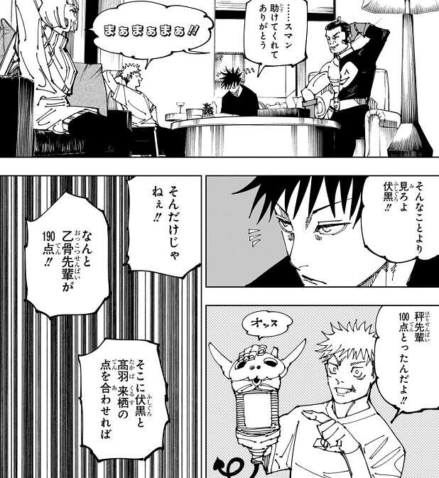 場面は東京第1結界(コロニー)に移り、伏黒が目を覚ますとホテルの一室に居て、その部屋には虎杖の他に、天使・来栖華がいました。伏黒は来栖に助けられて、その後来栖が伏黒を運んでいる所に虎杖、髙羽が遭遇、そのまま四人は合流しました。食料を探していた高羽もホテルの部屋に戻ってきて、四人で現在の状況を整理することにします。
