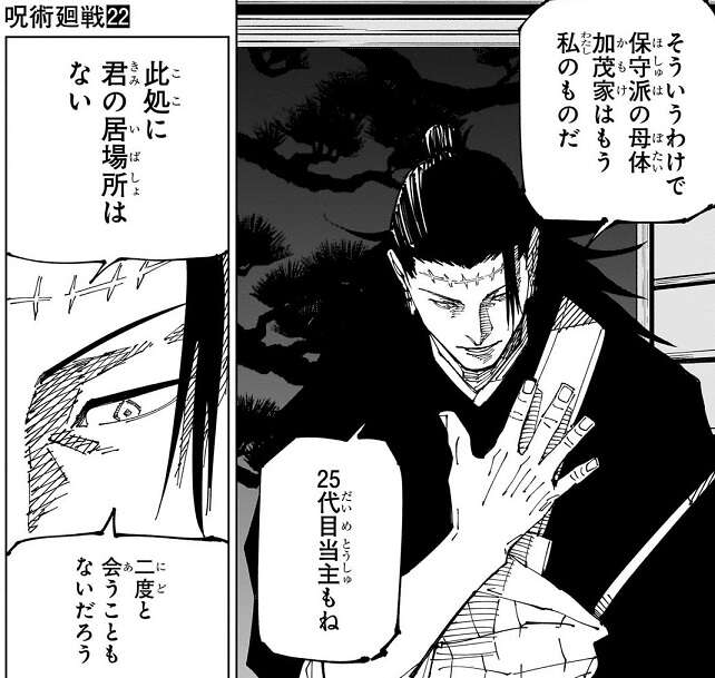 時間は戻り、虎杖と脹相が東京で呪霊を狩っていた頃より前の11月3日、加茂憲紀は、楽巌寺学長、五条家、禪院家と連絡を取ろうと、加茂家宗家屋敷に戻っていました。しかし、加茂家は既に羂索に乗っ取られていて、羂索は25代目当主となっていました。憲紀は楽巌寺学長に嘆願して、総監部の通達を取り下げてもらおうと考えていましたが、羂索は加茂憲紀の考えを読んでいました。