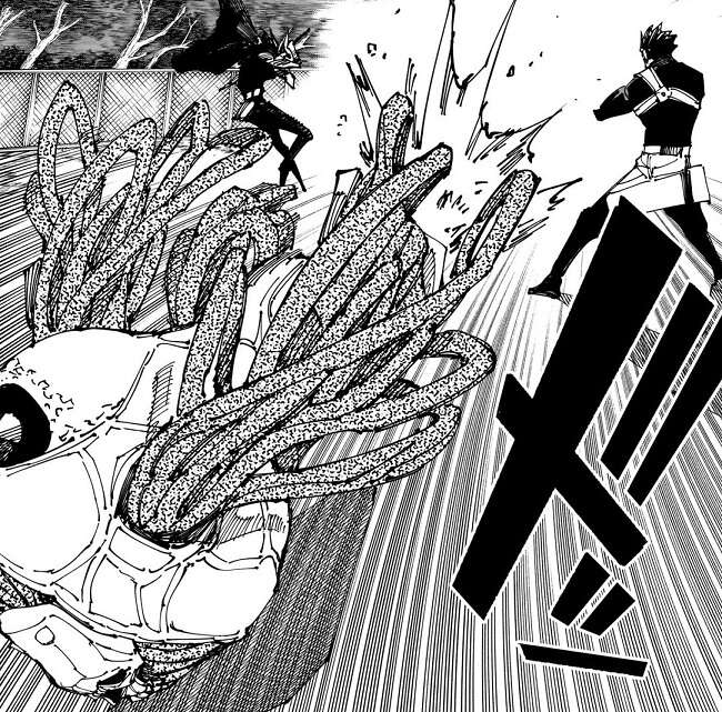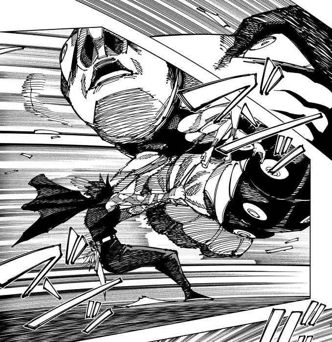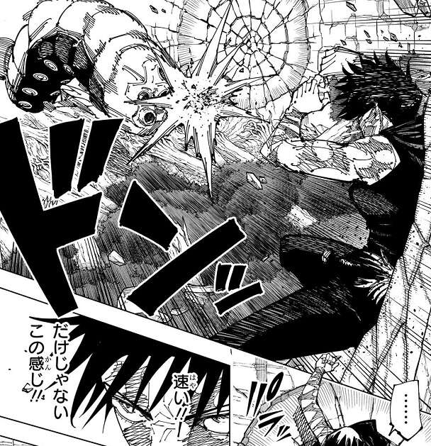 成体となった直哉は術式・投射呪法を使用して、空気を固定し拳で捉えて爆ぜさせて、真希や加茂憲紀を攻撃します。その後直哉は、体の吸気口から音速で取り込んだ空気をラム圧と呪力で圧縮し体外へ排気することでさらに推進力を得て、マッハ3に達するスピードで真希に体当たり攻撃を行います。