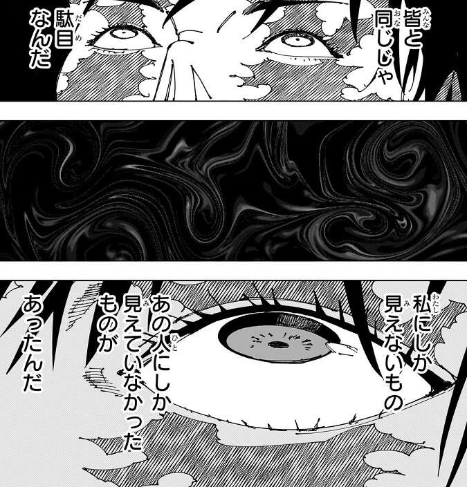 三代の領域から出てきた真希を見て、加茂憲紀も大道も真希が明らかに別物になった事を感じ取ります。直哉は再び距離を取り、マッハ3に達するスピードで真希に体当たり攻撃を仕掛けようとします。しかし、開眼した真希には見えないものが見えるようになってきたようで、直哉の体当たり攻撃もあっさりとかわします。