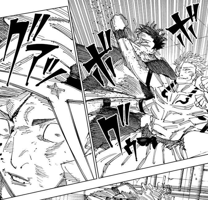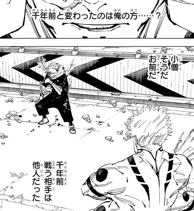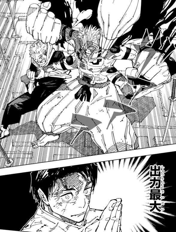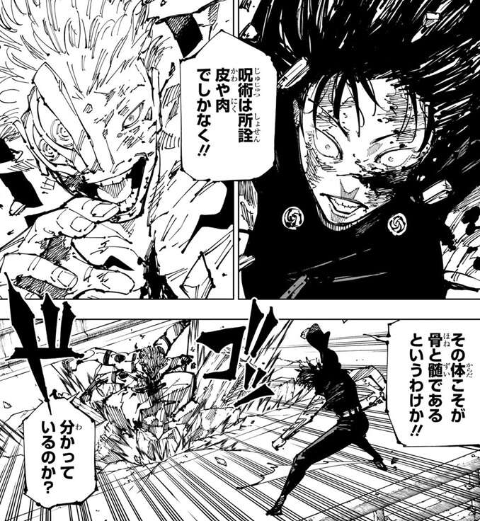猪野と日下部も宿儺戦に参加しつつ、真希と宿儺の戦いは苛烈を極めていきます。真希は乙骨が助かってもこのまま戦いが長引けば次の問題が生じると考え、宿儺をここで倒しておこうと考えます。一方、五条悟の死後、鹿紫雲一、日車寛見、乙骨憂太、それぞれが逸品の呪術の才能で宿儺をもてなしました。しかし、宿儺の食指を最も動かしたのは、先ほどの三人ではなく呪術を捨て去った天与呪縛の禪院真希でした。この現実に、宿儺は高揚していて好戦的になってきます。