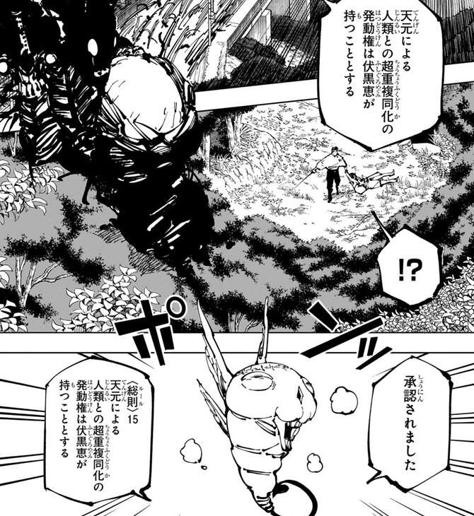 岩手県御所湖結界(コロニー)で羂索を倒した乙骨ですが、首だけになった羂索はコガネにルールの追加を要求、天元による人類との超重複同化の発動権は伏黒恵が持つこととする、という<総則(ルール)>15が追加されてしまいます。宿儺が天元との超重複同化の発動権を持ってしまい、これで宿儺を殺さないと天元との超重複同化は防げないことになってしまいます。