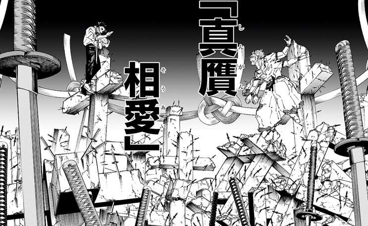 乙骨は領域展開「真贋相愛」で今まで模倣した術式を使用して、宿儺を徐々に追い詰めていきます。さらに虎杖の、宿儺と伏黒の魂の境界を知覚し打ち込む攻撃により“浴”で沈んだ伏黒の魂が叩き起こされ、宿儺と伏黒の肉体の同調を阻害します。虎杖と乙骨はここで決着をつけようと、宿儺をさらに追い込んでいきます。