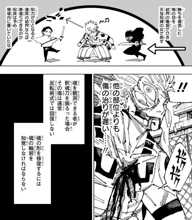 宿儺の世界を断つ斬撃「解」をくらってしまった乙骨は致命傷を負ってしまいますが、勝利を確信した宿儺の背後を真希が強襲します。真希は相手の硬度を無視して魂を切り裂く「釈魂刀」で宿儺を肉体を貫き、宿儺に大きなダメージを与えることに成功します。しかし、宿儺は反転術式で傷を修復しつつ、呪力で強制的に心臓を動かし真希と戦い続けます。