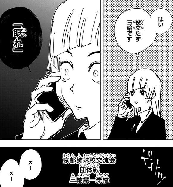 一方、真希に刀を取られた三輪は携帯を通じて狗巻棘に呪言で眠らされてしまい、そのままリタイヤとなってしまいます。三輪をリタイヤさせた狗巻棘は、次の場所へと向かおうとしますが、そこに準1級呪霊が現れます。