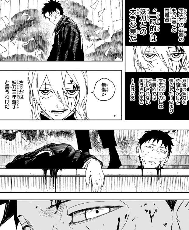 首を斬られた妖術師の生首が丁度、観客の方を見る形で落ちてしまい、観客は悲鳴を上げます。一方、昼彦は雫天石の武器のもう一つの問題点、“一時的”は妖刀との大きな差だと考え、双城は妖刀を時間をかけて慣らした…つまり雫天石の力には一時的では扱いきれない奥行きがある、と分析します。また無傷のチヒロを見て、さすが妖刀三年選手だと褒めます。