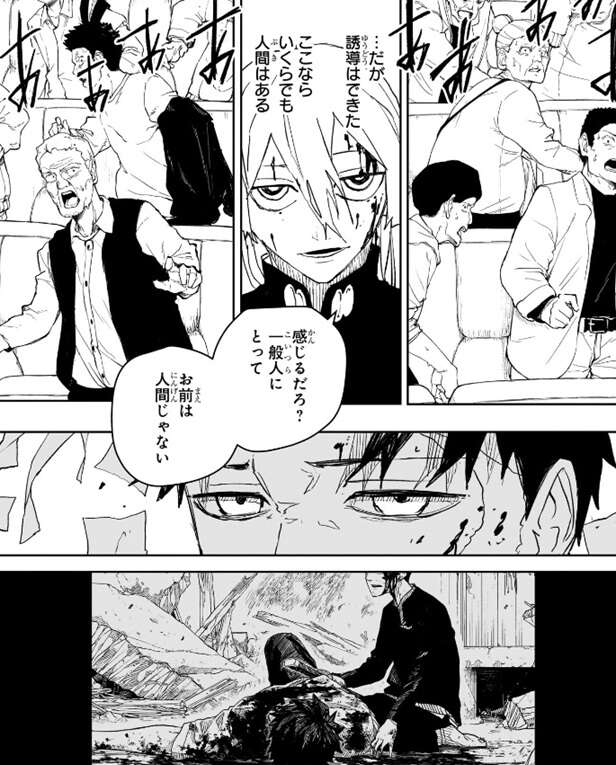 さらに3人の妖術師に指示してチヒロを劇場の舞台へと誘導、逃げ惑う観客をチヒロに見せつけたり、チヒロを人殺しとして恐れる観客の表情を見せたりと昼彦は悪辣な手段を使い、チヒロに自分と同じ人殺しだと理解させようとします。