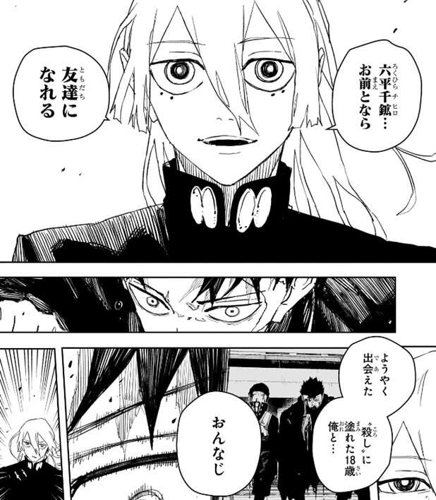 一方、昼彦はチヒロが戦る気になって嬉しいようで、同じ18歳だとチヒロに教えます。さらに昼彦は3歳の頃に“人を殺す”という選択肢を知り、俺の血肉は“殺し”で出来ているとチヒロに言います。しかし、周りの同じ年の子はそうでもないらしく、今日までずっと…対等に友と呼べる奴はいなかった、と昼彦は語ります。