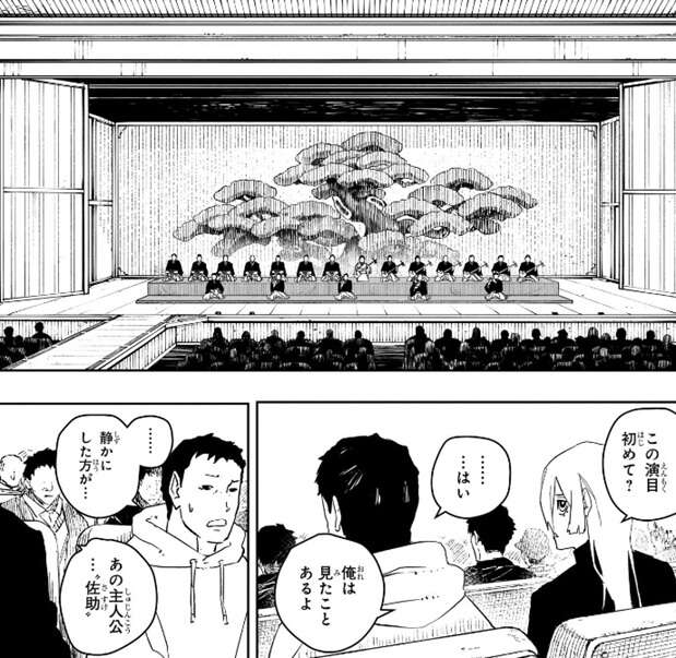 昼彦は紙の妖術で姿を消すと、演劇の劇場へと入っていきます。劇場では『佐廼島戦(さのしまいくさ)』という演劇がまもなく開演しようとしていました。