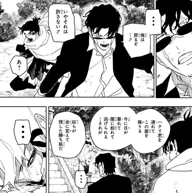 巻墨のおかげで座村、漆羽、ハクリの三人は無事、仙沓寺前まで脱出することに成功します。しかし、仲間を残したまま自分だけ逃げる事に納得がいかない座村は仙沓寺に戻ろうとしますが、漆羽に止められます。ハクリを連れてこの崖を降りれば、日が暮れて闇に紛れて逃げられる、それが巻墨が命に代えて残した勝ち筋だ、と漆羽は座村に言います。
