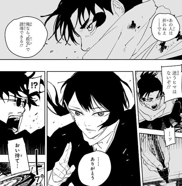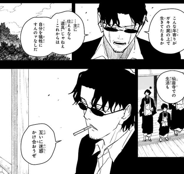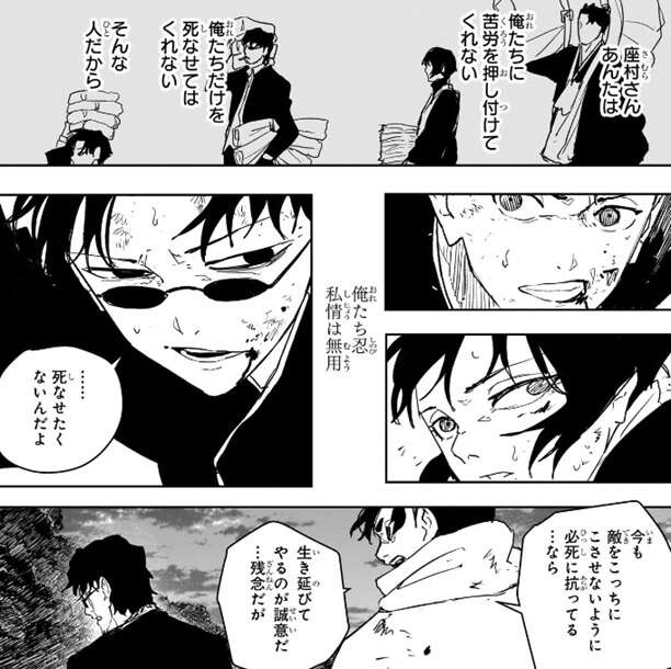 しかし座村は巻墨の言葉に、…だから余計なお世話だっつってんだ、と答え、優秀かしらねぇがお前らみたいなガキが…、と言った所で、巻墨の隊長はハタチを超えていると反論しますが、座村は20代もガキだと言います。そして、こんな年寄りがガキの屍の上で生きてたまるか、…おれに仕えるなら“道具”じゃなぇ、…これからは自分を犠牲にすんのァなしだ、と座村は巻墨に言います。仙沓寺での生活も互いに迷惑かけ合おうぜ、と言った所で回想は終わり、再び仙沓寺での戦いの場面に戻ります。座村が巻墨全員に、お前ら全員で切り抜けるぞ、と発破をかけます。すると漆羽は、そもそも座村サンがこの陣に自ら乗ると思うか?と、脱出用移動陣に仲間を見捨てて乗ると思うかと疑問を口にし、女の巻墨も心の中で同意します。