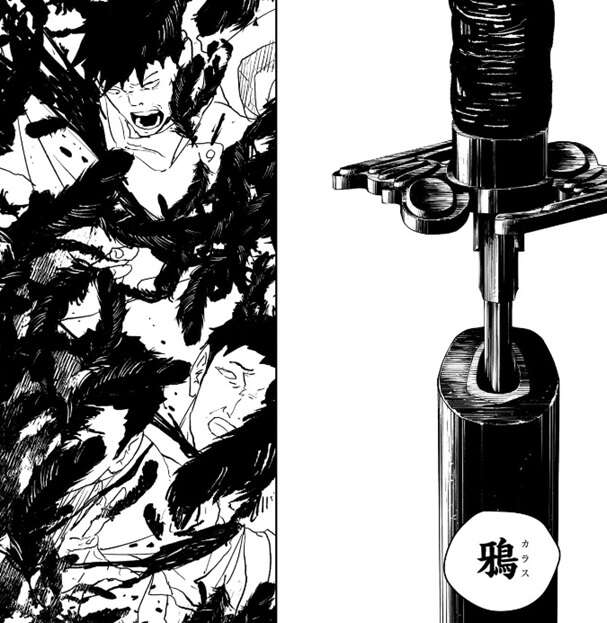 座村は飛宗の能力と思われる「鴉(カラス)」を使用します。すると、敵の妖術師の周りを大量の鴉の羽が舞い、敵の妖術師が次々に斬られていきます。