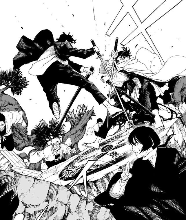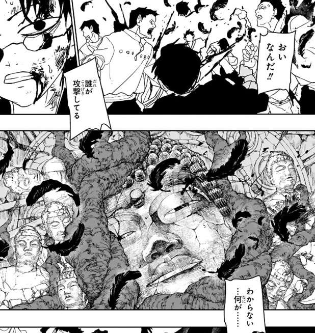 毘灼の幹部が生やした松が建物を破壊した影響で、建物が限界にきて崩壊を始めます。毘灼の幹部は、先に建物の限界が来たか、こっちも終わらせよう!と言うと、敵の妖術師がさらに襲い掛かってきます。一方、座村は轟音と硝煙で感覚が機能しなくなっていて、視界で最も光るのは“殺気”、座村はその殺気という灯に斬りかかっていました。そして座村はこの混沌の中一際輝く灯に、座村の殺意は導かれて、そちらへと移動し斬りかかります。