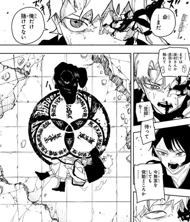 ハクリはまだ回復が十分でありませんでしたが、まだ自分だけ命を賭けていないと言うと、蔵の能力を発動させて、まずは座村か漆羽に触れて“登録”をしようとします。しかし、かなりの無茶だったようでハクリは鼻血を出しながら意識を失い、蔵の能力は不発に終わります。女の巻墨は、ハクリは今無茶をすべきでない、その力はこの先も重要になる、と仙沓寺前行きの移動陣を早く完成させようとします。